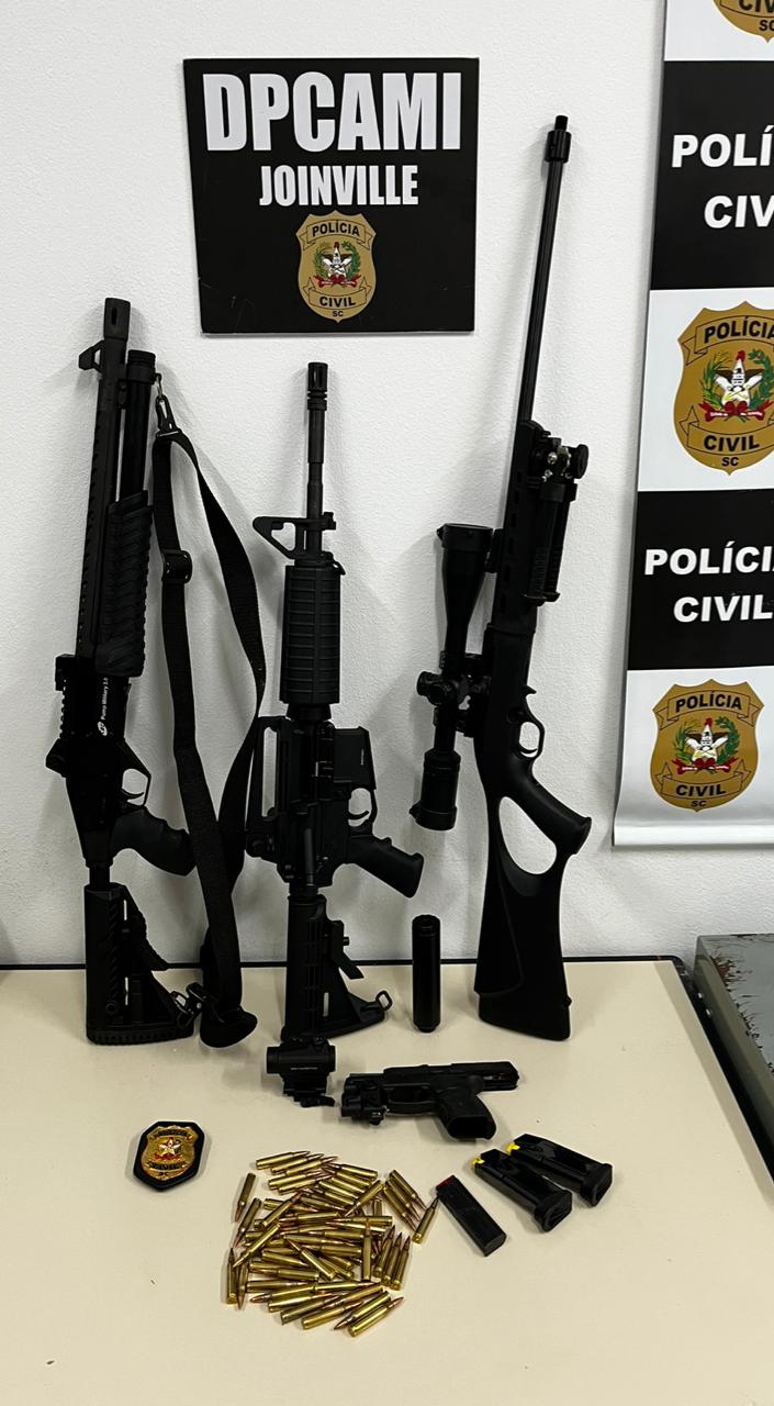 No bairro Atiradores, foram apreendidas: uma pistola Taurus TS9, calibre 9 mm e 21 munições calibre 9 mm (CBC). No bairro Vila Nova, os policiais apreenderam: um fuzil Taurus T4, calibre 5,56 mm, com 61 munições (CBC), uma pistola Taurus G2C, calibre 9 mm, uma carabina CBC 7022 WAY, calibre .22 e uma carabina CBC PUMP MILITARY 3.0, calibre .22.