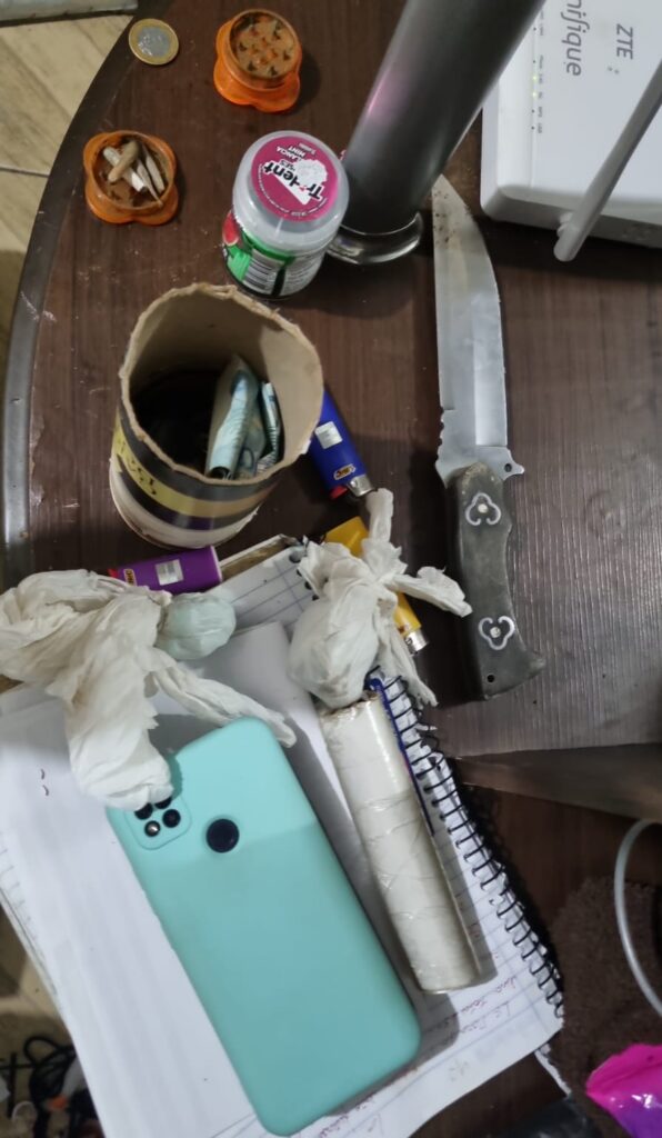 No interior do imóvel, foram encontradas porções de droga sobre um móvel na sala conjugada com a cozinha, bem como outras enterradas nos fundos do terreno. Ao todo, foram apreendidas aproximadamente 30 gramas de crack, além de uma balança de precisão, celulares com intensa troca de mensagens, um caderno com anotações referentes à movimentação do tráfico e diversos cartões bancários e de benefícios — sendo um deles pertencente à pessoa já conhecida dos meios policiais pela prática de posse de droga para consumo próprio.