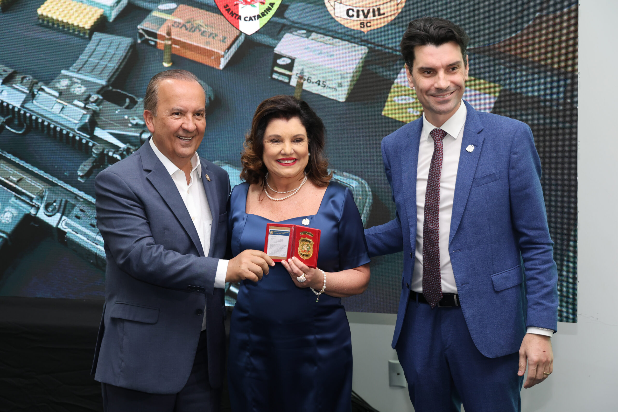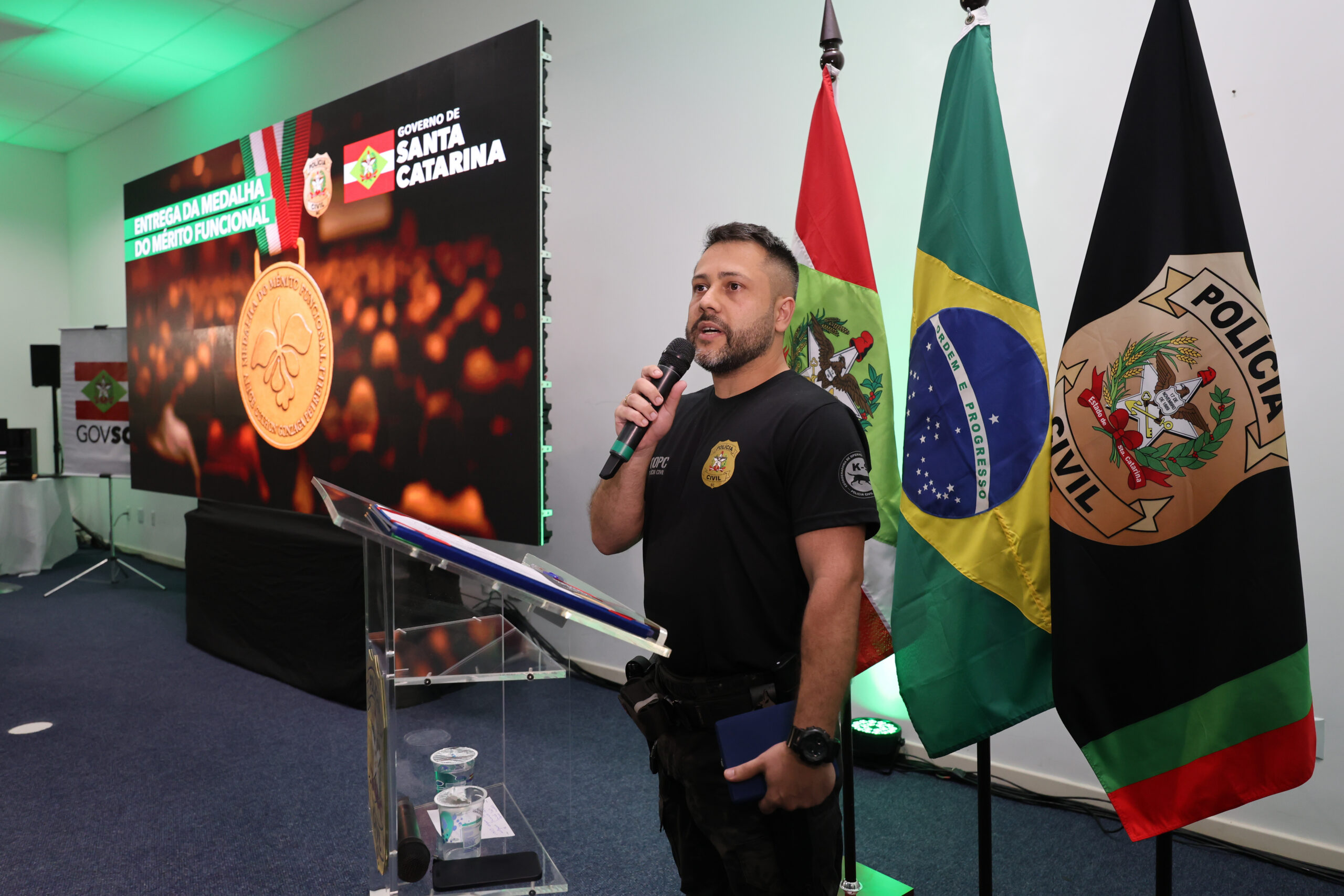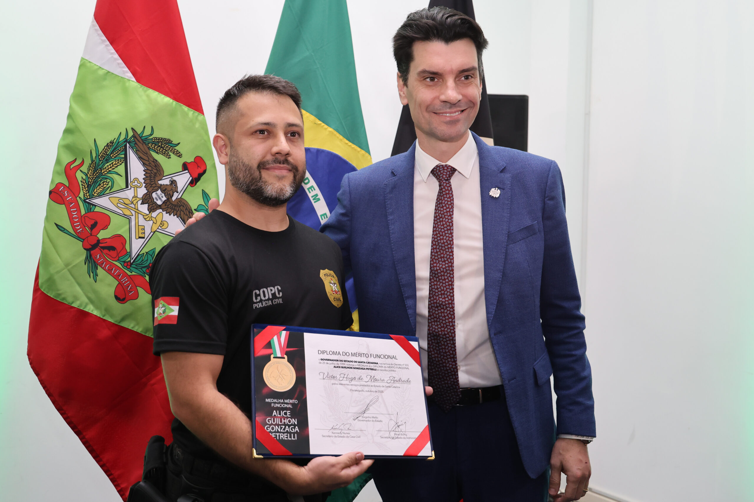 A solenidade também contou com uma homenagem ao Agente de Polícia Victor Hugo de Moura Andrade, que foi condecorado com a medalha de mérito funcional Alice Guilhon Gonzaga Petrelli. O policial, que conta com quase 20 anos de carreira, foi homenageado pelos serviços prestados à Polícia Civil de Santa Catarina.