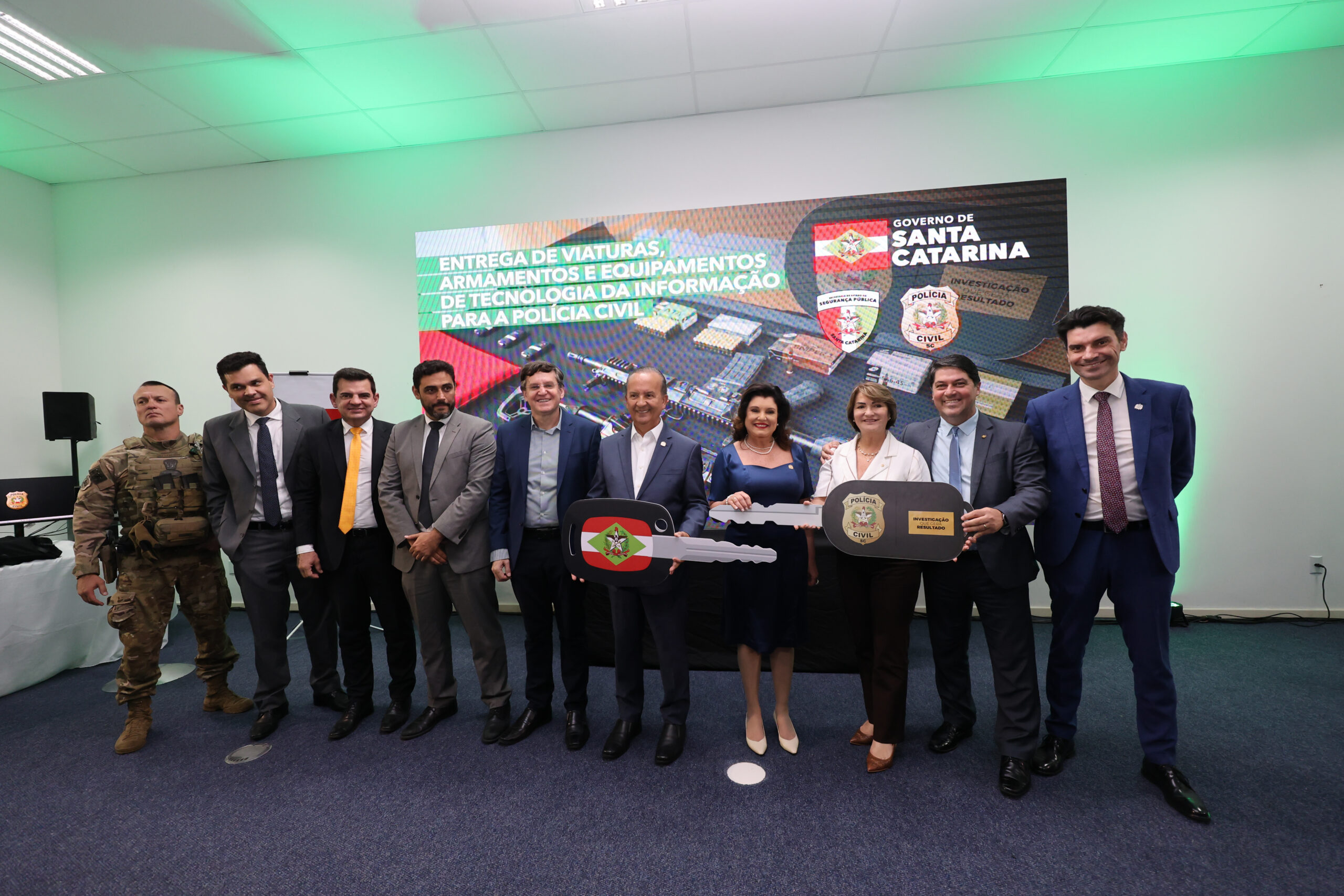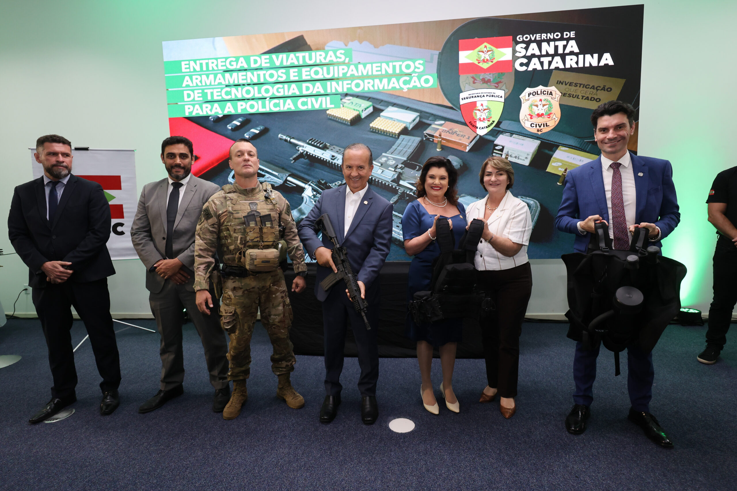 O governo de Santa Catarina realizou na tarde desta quarta-feira, 26, a entrega de novas viaturas, armamentos e equipamentos de segurança para a Polícia Civil. A cerimônia, realizada no auditório da Secretaria de Segurança Pública, contou com a presença do governador Jorginho Mello, da vice-governadora Marilisa Boehm e do Delegado-Geral de Polícia Civil Ulisses Gabriel. Ao todo, foram destinados R$23 milhões para a Segurança Pública dos catarinenses.