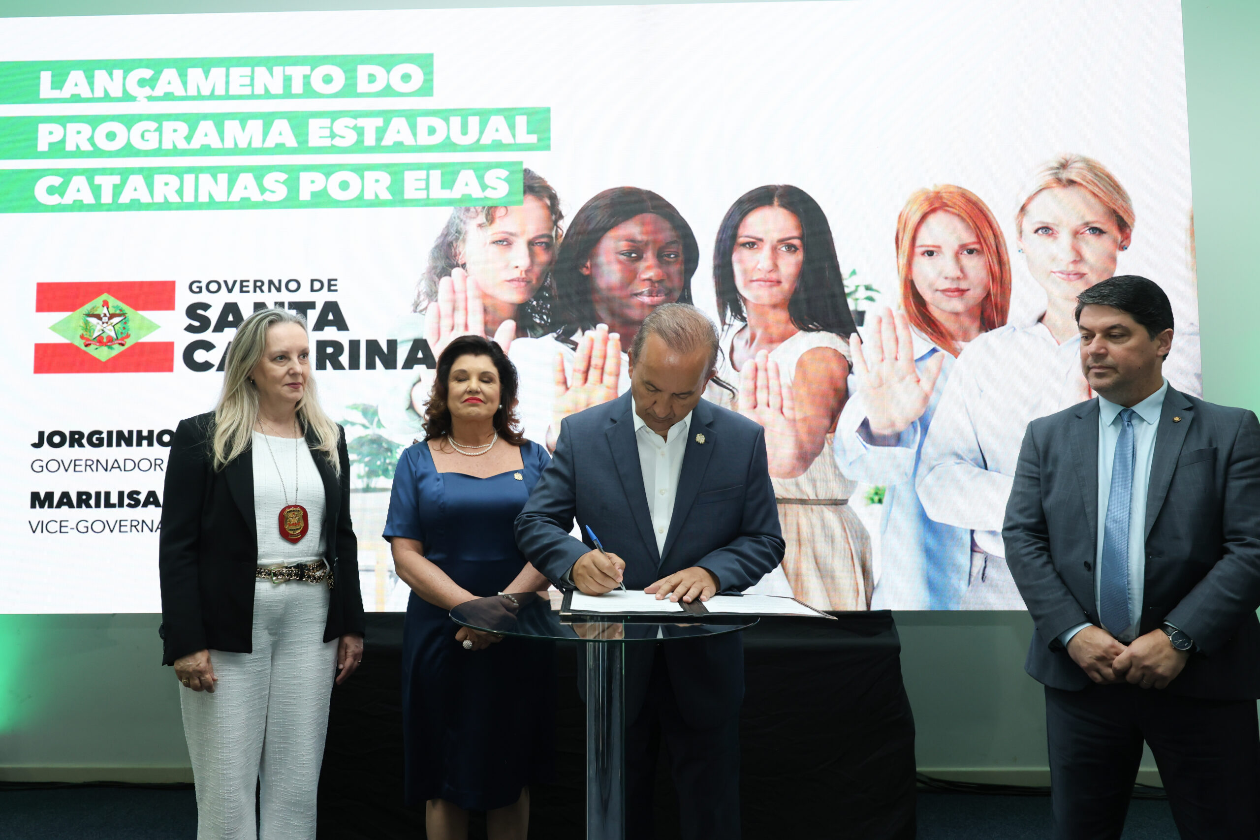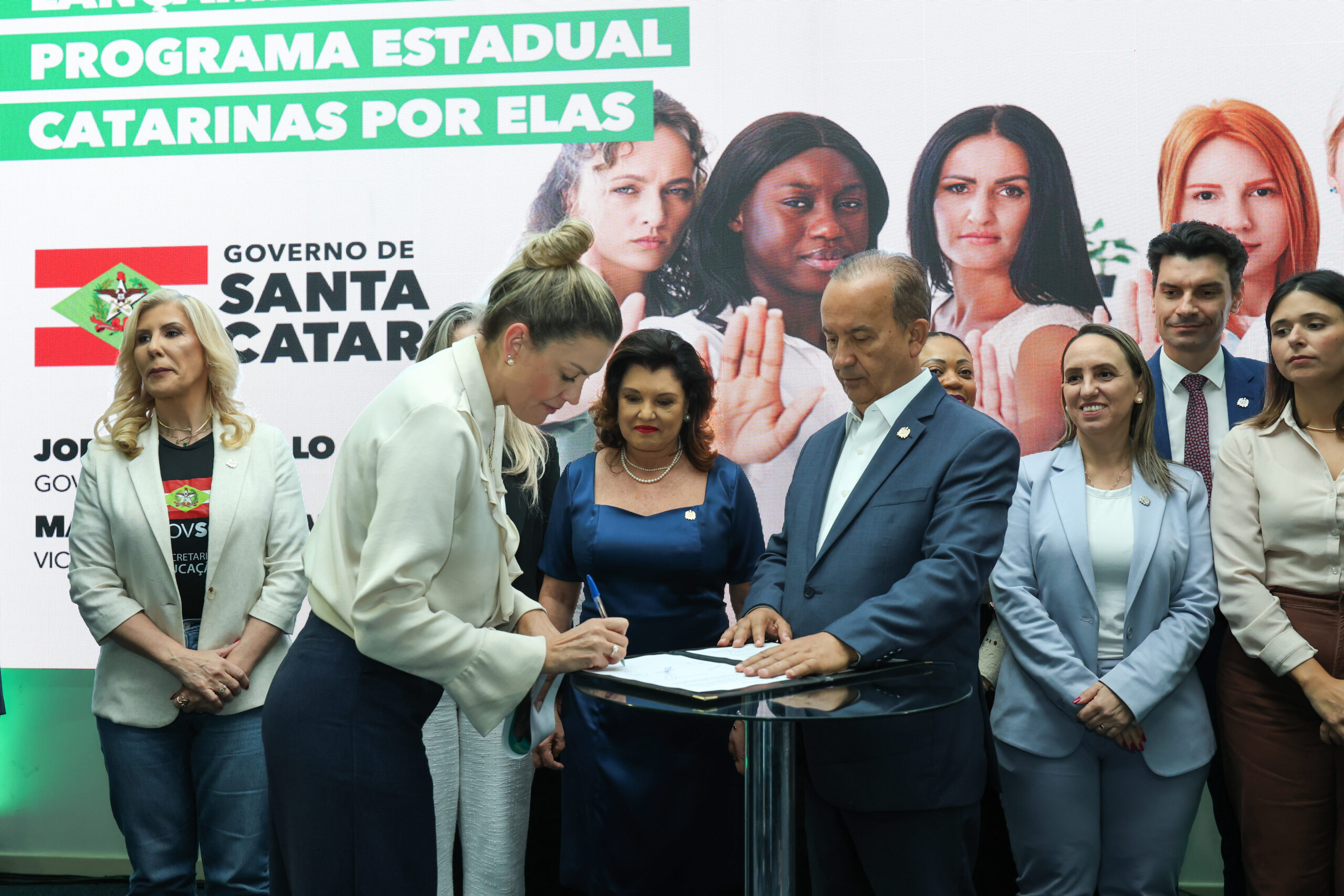 Durante a solenidade, também foi lançado o programa “Catarinas por Elas”, de enfrentamento à violência contra a mulher. O documento tem como objetivo formalizar o compromisso institucional de cada órgão e entidade do Poder Executivo Estadual para integrar e executar as ações do programa “Catarinas por Elas”, fortalecendo os mecanismos de justiça, proteção e autonomia, e colocando a vida das mulheres no centro das políticas públicas estaduais.