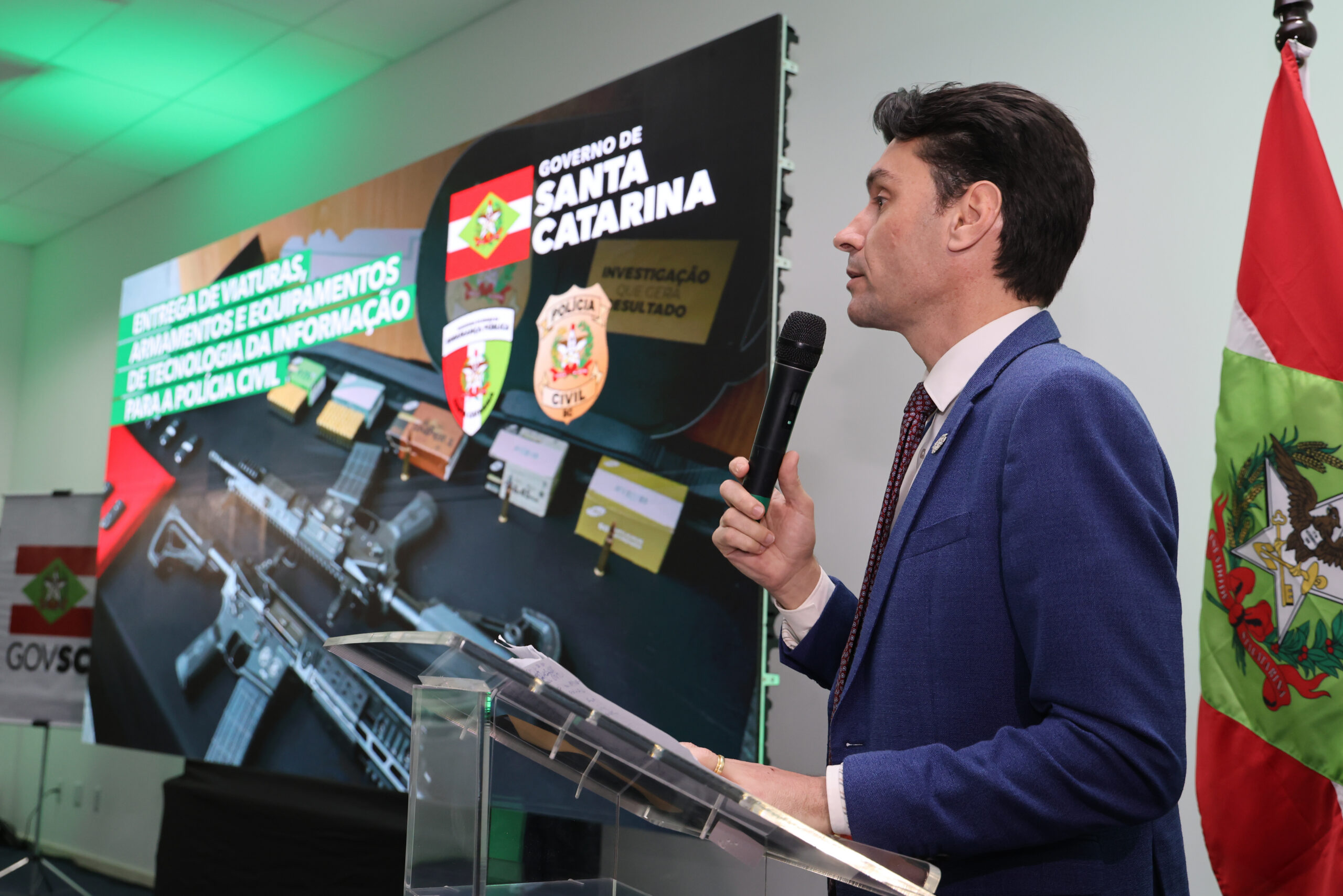 “Só hoje vão ser entregues milhões de reais em investimentos para a Polícia Civil de Santa Catarina. Pra se ter uma ideia, nós estamos fazendo a entrega de 400 coletes que são destinados a policiais de operações especiais e departamentos de investigação, que são coletes de placas balísticas que suportam tiros de fuzil 5,56 e calibre 7,62 que são usados por forças especiais americanas. Então, todos os policiais de forças especiais vão passar a usar esses coletes balísticos para enfrentar esses indivíduos que eventualmente queiram dominar a cidade ou praticar assaltos a bancos”, destacou.