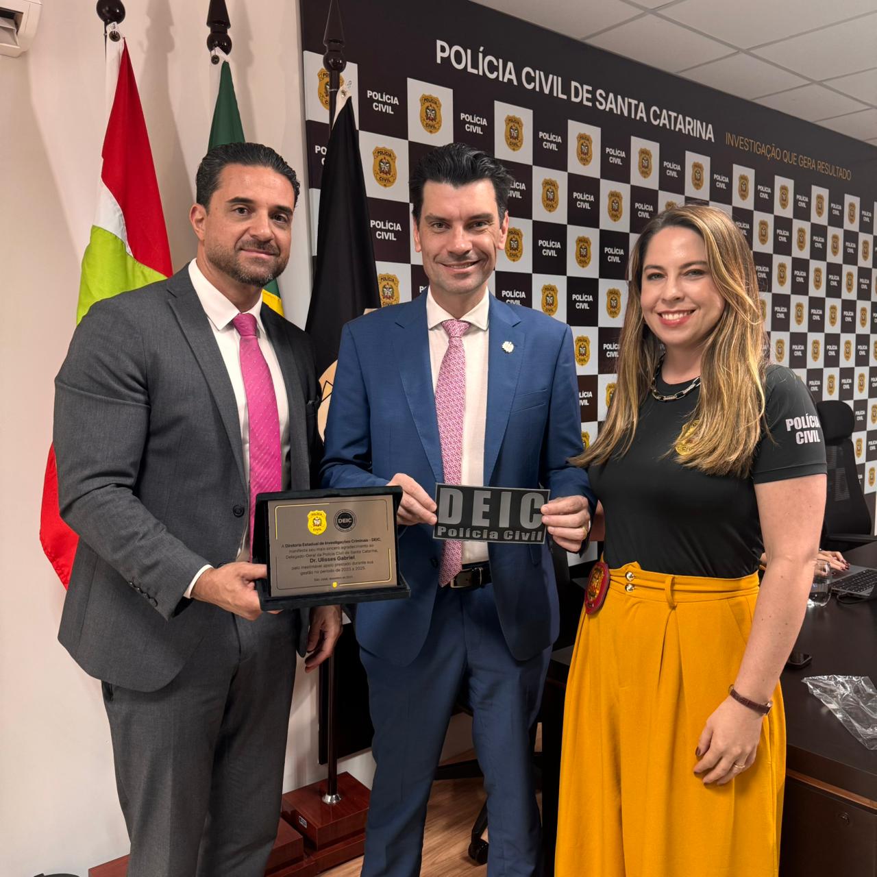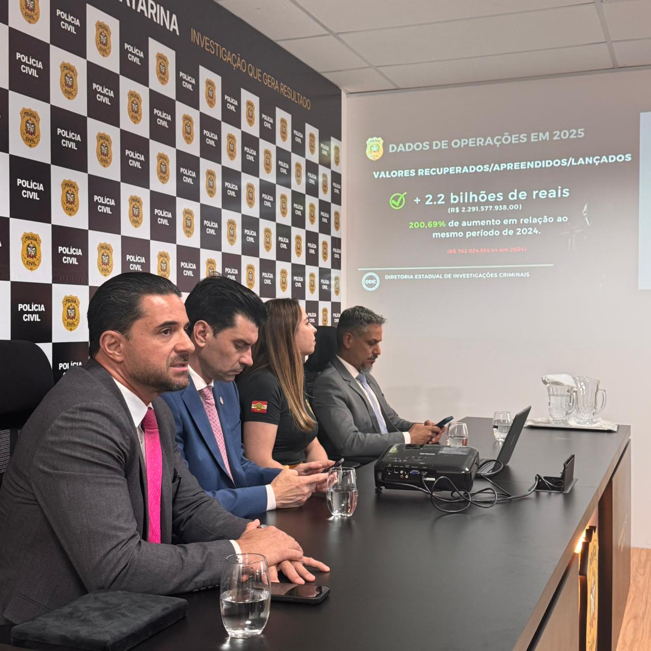 A Polícia Civil de Santa Catarina apresentou, nesta quinta-feira (18/12), os resultados históricos alcançados pela Diretoria Estadual de Investigações Criminais (DEIC) em 2025. Os dados foram divulgados durante coletiva de imprensa realizada na Sala de Imprensa da Delegacia-Geral, em Florianópolis, com a presença do delegado-geral da PCSC, Ulisses Gabriel; do diretor-geral da Delegacia-Geral, delegado Marcelo Nogueira; do diretor da DEIC, delegado Daniel Régis; e da diretora-adjunta da DEIC, delegada Carolina Surita.