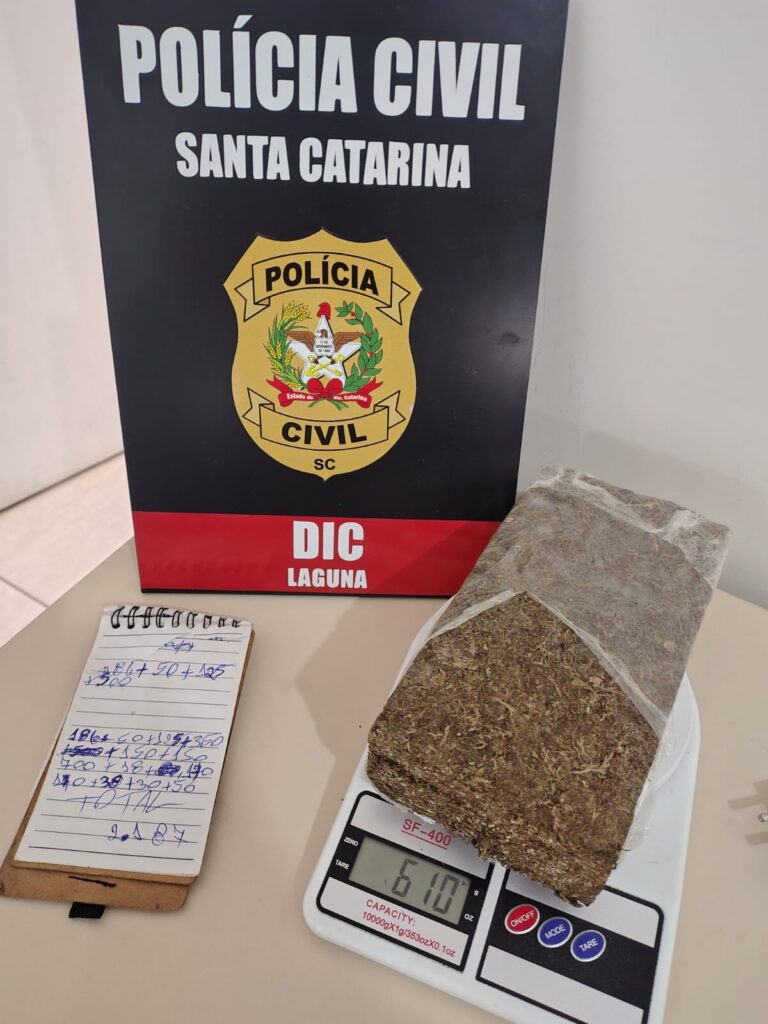 A investigação é conduzida pela DIC de Laguna há aproximadamente três meses e tem como objetivo identificar e desarticular pessoas envolvidas na comercialização de entorpecentes na região. Durante as diligências desta tarde, os policiais apreenderam um “tijolo” de maconha, pesando cerca de 610 gramas, além de anotações relacionadas à contabilidade do tráfico de drogas.