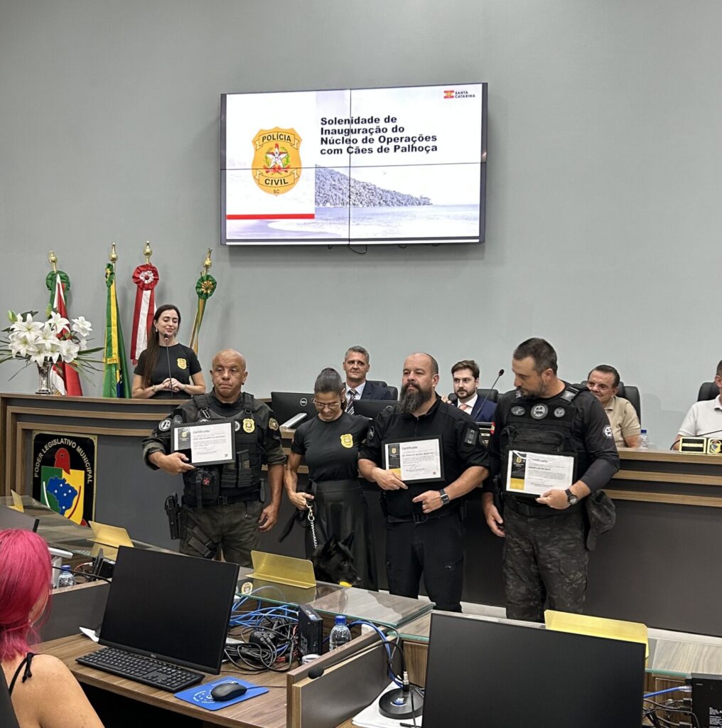 A segurança pública da Grande Florianópolis ganha reforço nesta quarta-feira (04/03). Em solenidade realizada na Câmara Municipal de Palhoça, a Polícia Civil de Santa Catarina (PCSC) oficializou a inauguração do Núcleo de Operações com Cães (NOC) de Palhoça. O evento, que reuniu autoridades estaduais e municipais, também foi marcado pela emocionante despedida do K9 Smith, cão que encerra sua trajetória de serviço com um legado de combate ao crime.