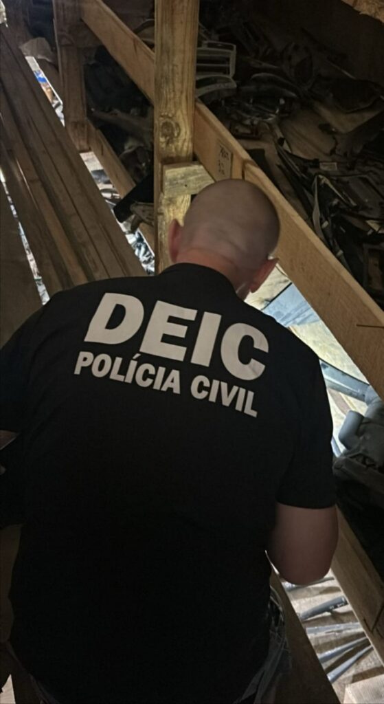 Diante das informações recebidas, a equipe da DFRV/DEIC, em conjunto com a Polícia Científica, realizou fiscalização no galpão indicado, onde foram encontrados componentes automotivos pertencentes a 10 veículos com procedência ilícita, sendo 1 com registro de furto e 9 com a numeração suprimida. A supressão dos sinais identificadores é uma prática utilizada para dificultar a identificação da origem ilícita das peças e viabilizar sua comercialização no mercado clandestino.