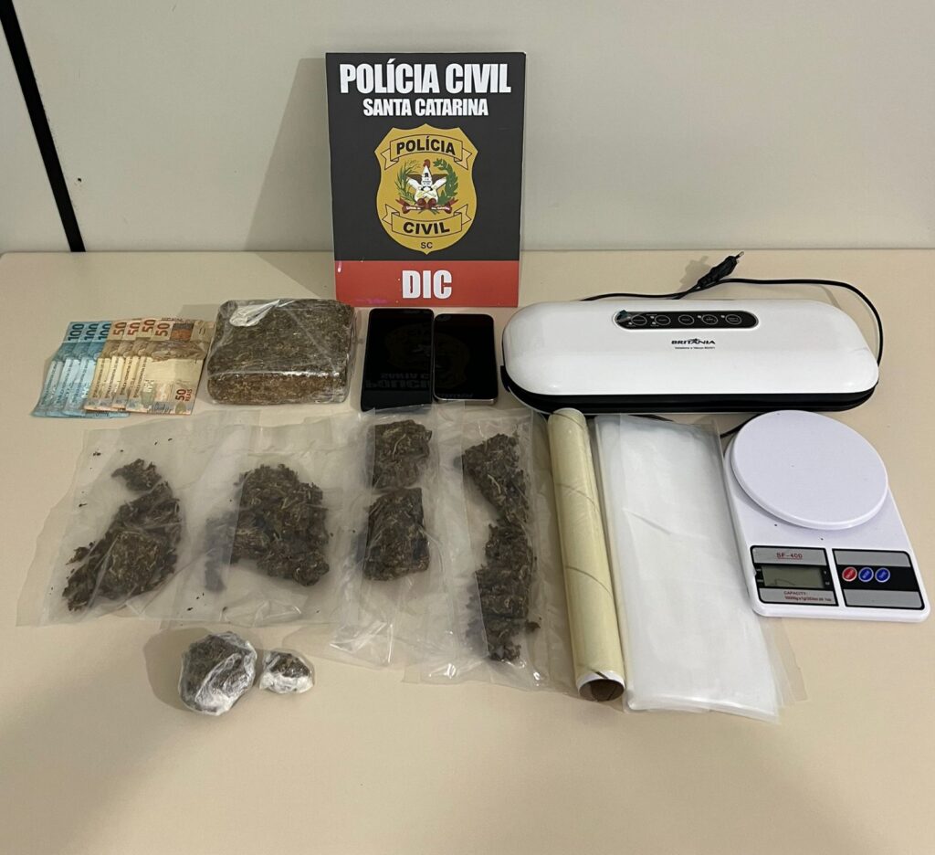 No imóvel, os policiais localizaram aproximadamente 795 gramas de maconha, sendo que parte da droga já estava fracionada e pronta para a comercialização. Além do entorpecente, foram apreendidos uma balança de precisão, uma embaladora a vácuo, dinheiro em espécie e dois aparelhos celulares.