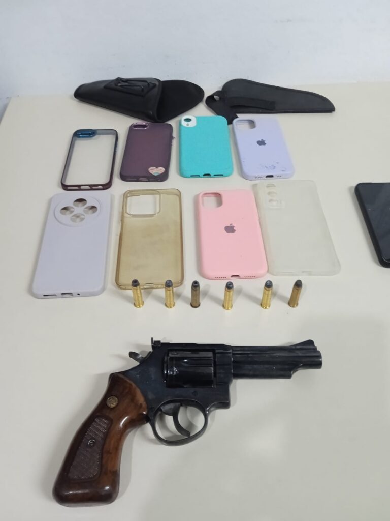 Durante as buscas no imóvel alvo da operação, os policiais civis localizaram e apreenderam um revólver, munições e diversas capas de aparelhos celulares. O material apreendido será submetido a perícia e análise para instruir o inquérito policial em curso.
