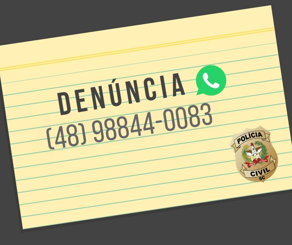 Polícia Civil de Santa Catarina no WhatsApp Agora você pode denunciar enviando mensagens com fotos, vídeos e documentos para auxílio de investigações criminais: através do telefone (48) 98844-0083. O serviço está disponível para receber denúncia de forma fácil e ágil, com a garantia de sigilo absoluto.